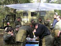 На удивление утром себя нашел в весьма прекрасном состоянии. Чашка кофе и утренний лесной воздух окончательно вернули меня в мир людей. За заботами по сборам "на войну" чуть не прозевали построение. Одними из последних выдвинулись из лагеря. На дороге уже толпилось множество бойцов из различных команд. Долго решали строиться ли по росту, в одну, две или три шеренги, и вообще кому нужна вся эта показуха! Построения и перепостраения навивали тоску.