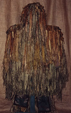 В отличии от камуфляжной (в нашем понятии) униформы он призван в первую очередь размыть силуэт путём создания объёма и более эффективно гармонировать с окружающей средой путём тщательного подбора цветовой гаммы. Маскировочный костюм Гилли был впервые использован на войне снайперами британских скаутов во время крупномасштабных противоснайперских действий в первую мировую войну. Концепция такого костюма зародилась в Шотландии, где были сформированы подразделения скаутов. В Шотландии многие поколения егерей использовали подобный наряд для маскировки, когда они выслеживали браконьеров. Костюм Гилли состоит из одной или двух частей, к которым пришиты сотни полосок ткани разных цветов, чтобы снайпер полностью слился с местностью, в которой он действует. Конечно, костюм Гилли можно изготовить и самим. Во к примеру один из вариантов наставления по изготовлению "объёмного камуфляжа" (специальное маскировочное снаряжение), для наших курсантов: ...куртка выворачивается наружу так, чтобы карманы оставались с внутренней стороны. Из спины вырезается большая часть, а вместо нее вшивается материал в мелкую сетку для вентиляции. На спину, плечи, рукава и заднюю сторону брюк нашиваются куски маскировочной сети, а на локти, переднюю сторону брюк и куртки - куски брезента. К верхней части форменного головного убора с козырьком пришивают куски маскировочной сети, которые прикрывают спереди лицо и грудь, а сзади - затылок и плечи. Передняя часть сетки носит название-чадра должна доходить до пояса и иметь ширину 50 - 60 см. На огневой позиции снайпер набрасывает чадру сверху на прицел и ведет огонь, целясь через сетку. К маскировочной сетке прикрепляется наполнитель (волокна льна, носки, обрывки тряпок и т. п.), толщина которого должна быть 3 - 6 см. Он имеет двойное назначение - должен искажать очертания фигуры и служить защитой от приборов ночного видения. Перед выходом на огневую позицию, снайпер прикрепляет к наполнителю сверху свежую растительность. Костюм Гилли хорошо защищает от любого наблюдения, но руки и лицо надо укрывать дополнительно, например, зимними перчатками, марлей. Но это как говорится "по-бедности" ... Хороший костюм Гилли профессионального уровня, изготовленный вручную (как правило) при трудозатратах от 20 до 60 часов стоит от 250. Посмотрим,что нам предлагают зарубежные изготовители этого уникального камуфляжа: Одним из фаворитов производства является фирма