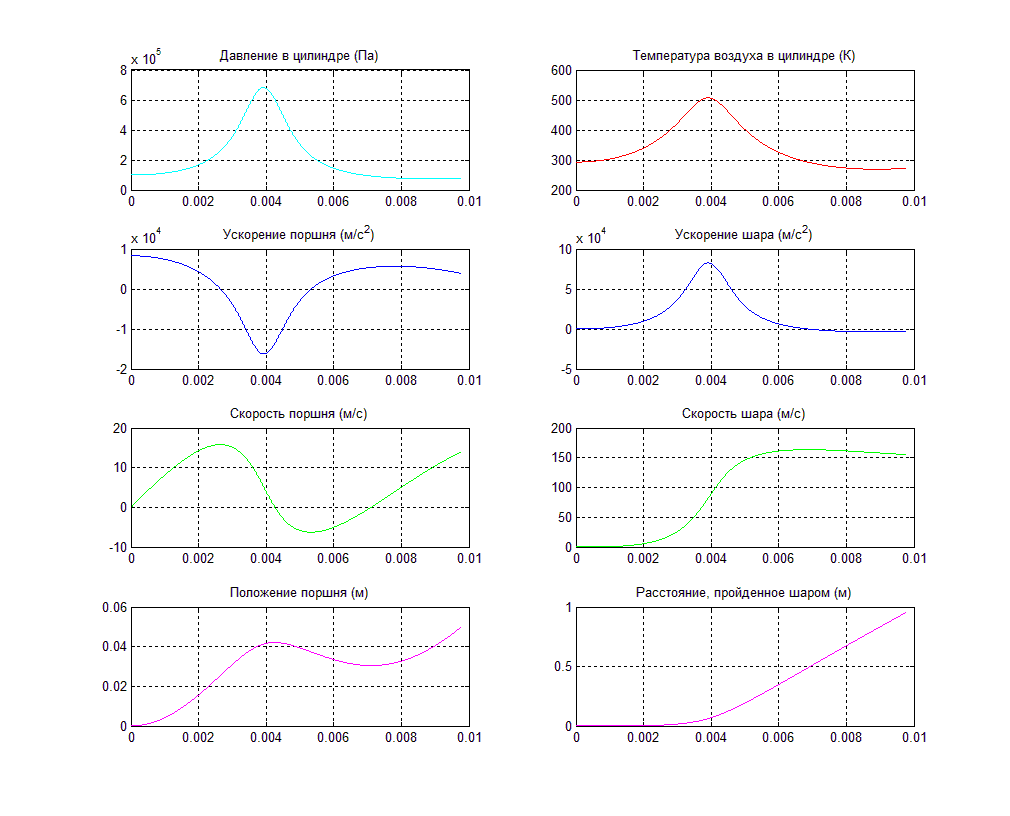 Каждый из данных графиков показывает изменение некоторой физической величины во времени. Время изменяется от нуля до некоторого значения - это значение и говорит о том когда поршень ударится о голову цилиндра. Все физические величины измеряются в единицах в соответствии с системой СИ.