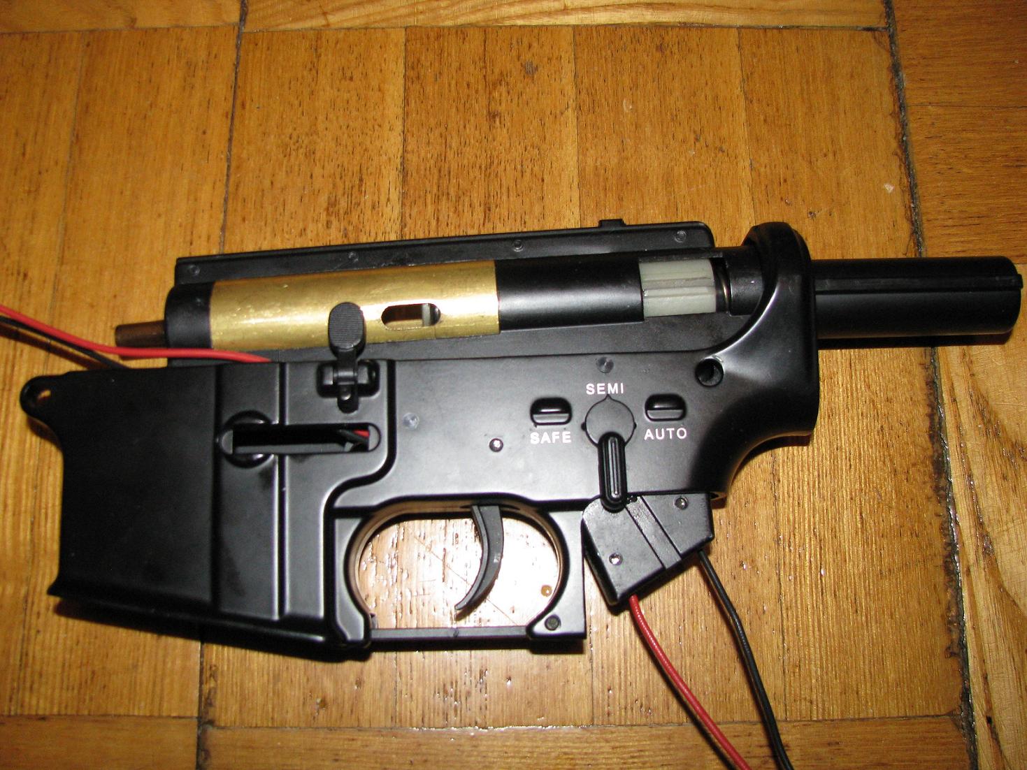 Привод M4-s System от Dboys. Что-то клинит в гирбоксе. Начал вытаскивать гирбокс из привода. Не могу выбить ось спускового крючка.