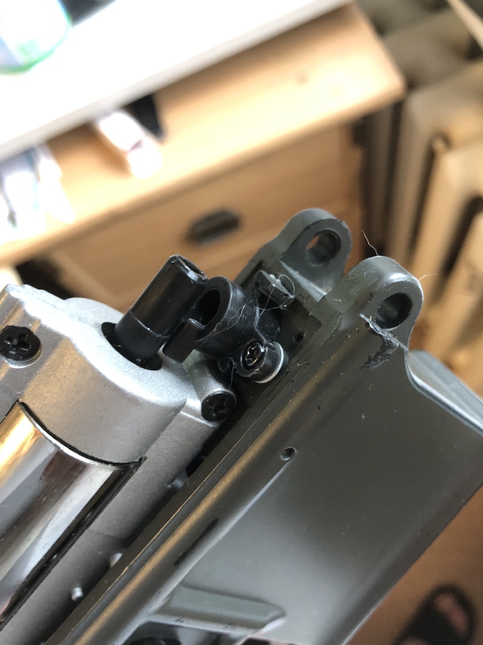 У этого привода какая то не стандартная камера хоп-апа, трубка (шароприемник?) крепится к нижнему рессиверу, а весь остальной хоп-ап как обычно к стволику, то есть получается хоп-ап состоящий из двух частей, а не как обычно просто цельная камера