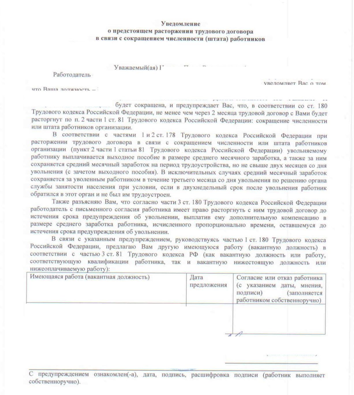 В принципе это стандартное письмо - уведомление о сокращении. Если кратко то расклада три: