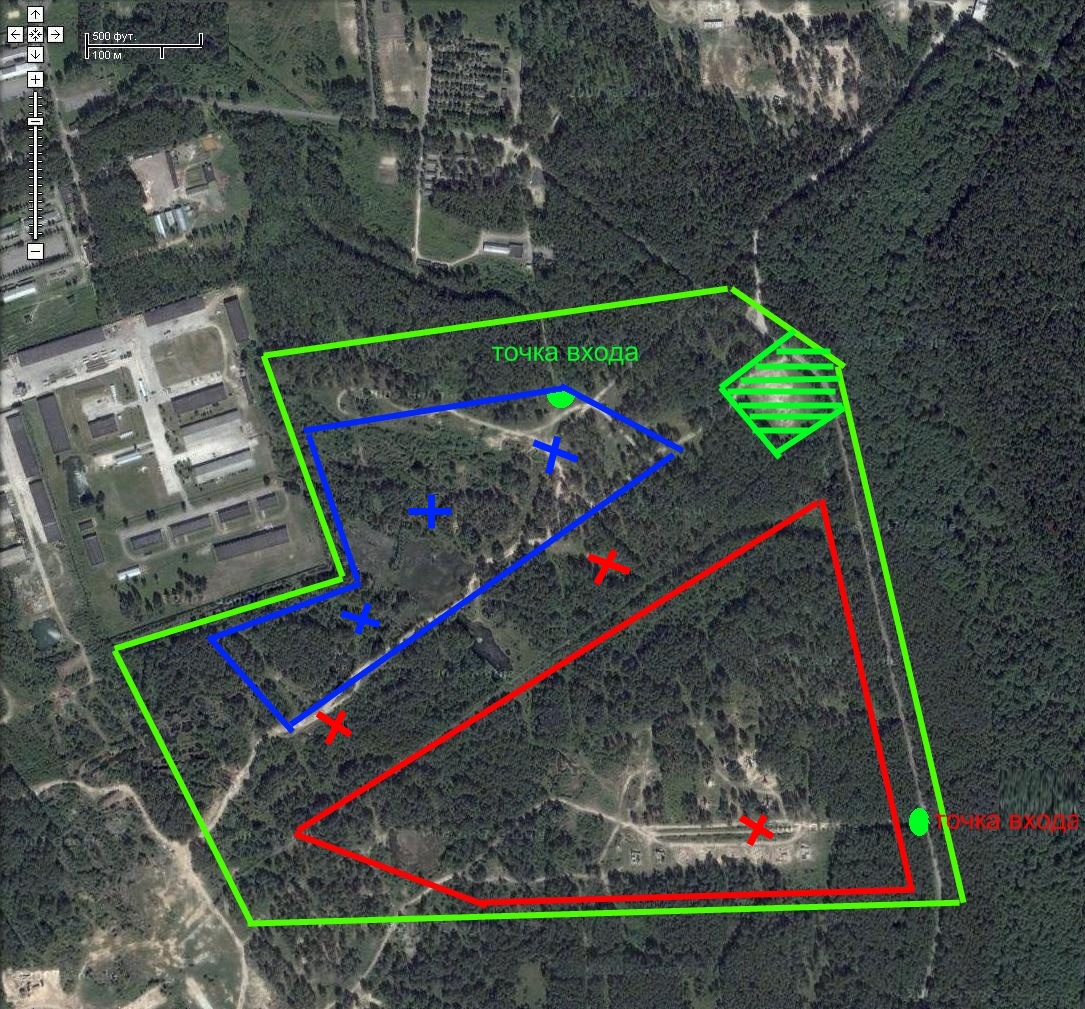 Сторона Оборона должна разметить 3 флага в точках обозначенных синими крестами. Сторона Атака должна разместить 3 флага в точках обозначенных красными крестами.