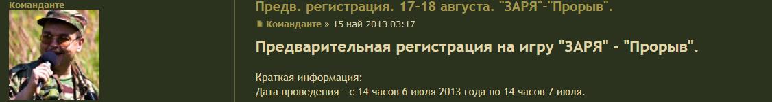 Команданте писал(а):По убедительной договоренности с остальными организаторами, "ЗАРЯ" - "Прорыв" передвигается на август. Вопрос, какая дата удобнее, 10-11 или 17-18 августа. Особо не оффтопим.